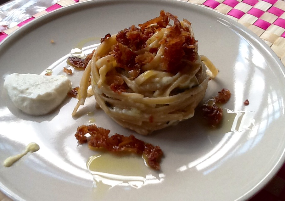 Oltre alla mousse ho usato zucchine romanesche (sono quelle verde chiaro, primaverili, arrivate da pochi giorni sui banchi dei mercati) e guanciale tagliato a fette sottili. Per prima cosa ho fatto tostare il guanciale in forno caldissimo finché è diventato croccante e poi l’ho spezzettato in modo grossolano. Intanto ho messo a bollire l’acqua per la pasta e ho tagliato le zucchine a fette non troppo spesse. In una padella ho fatto appassire un trito di cipolla e ho fatto saltare le zucchine a fuoco vivo aggiustando di sale e pepe. Ho sfumato con mezzo bicchiere di vino bianco e lasciato stufare per alcuni minuti. Come pasta ho scelto delle linguine integrali che ho cotto tenendole bene al dente e poi ho saltato insieme alle zucchine in padella usando un mestolo dell’acqua di cottura per mantecare. Fuori dal fuoco ho aggiunto la mousse di burrata mescolando tutto. Infine ho messo nei piatti e ho guarnito con il guanciale e un filo di olio a crudo.