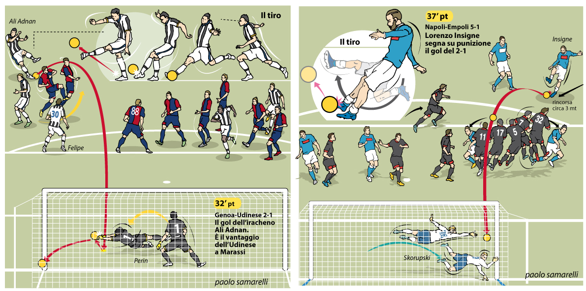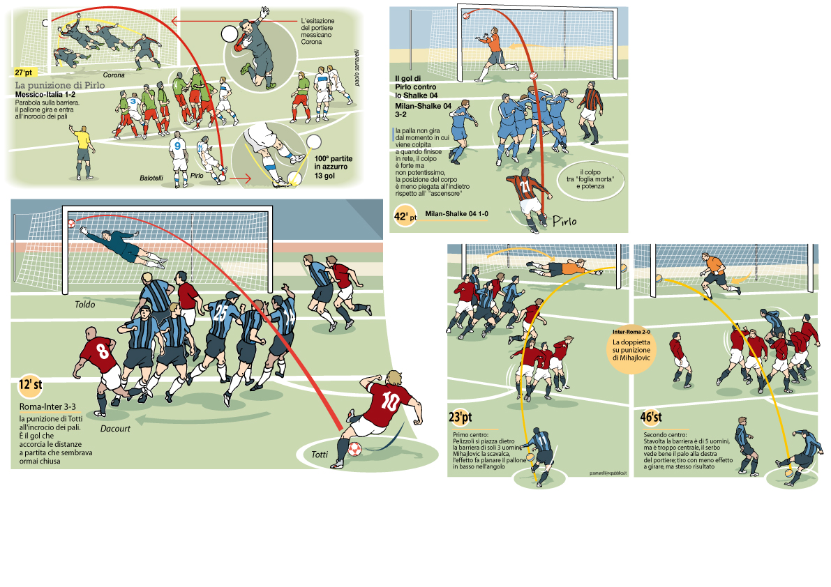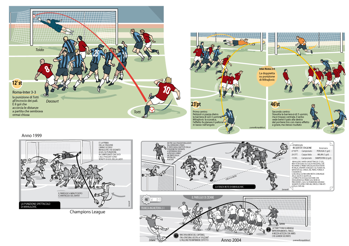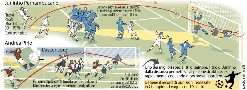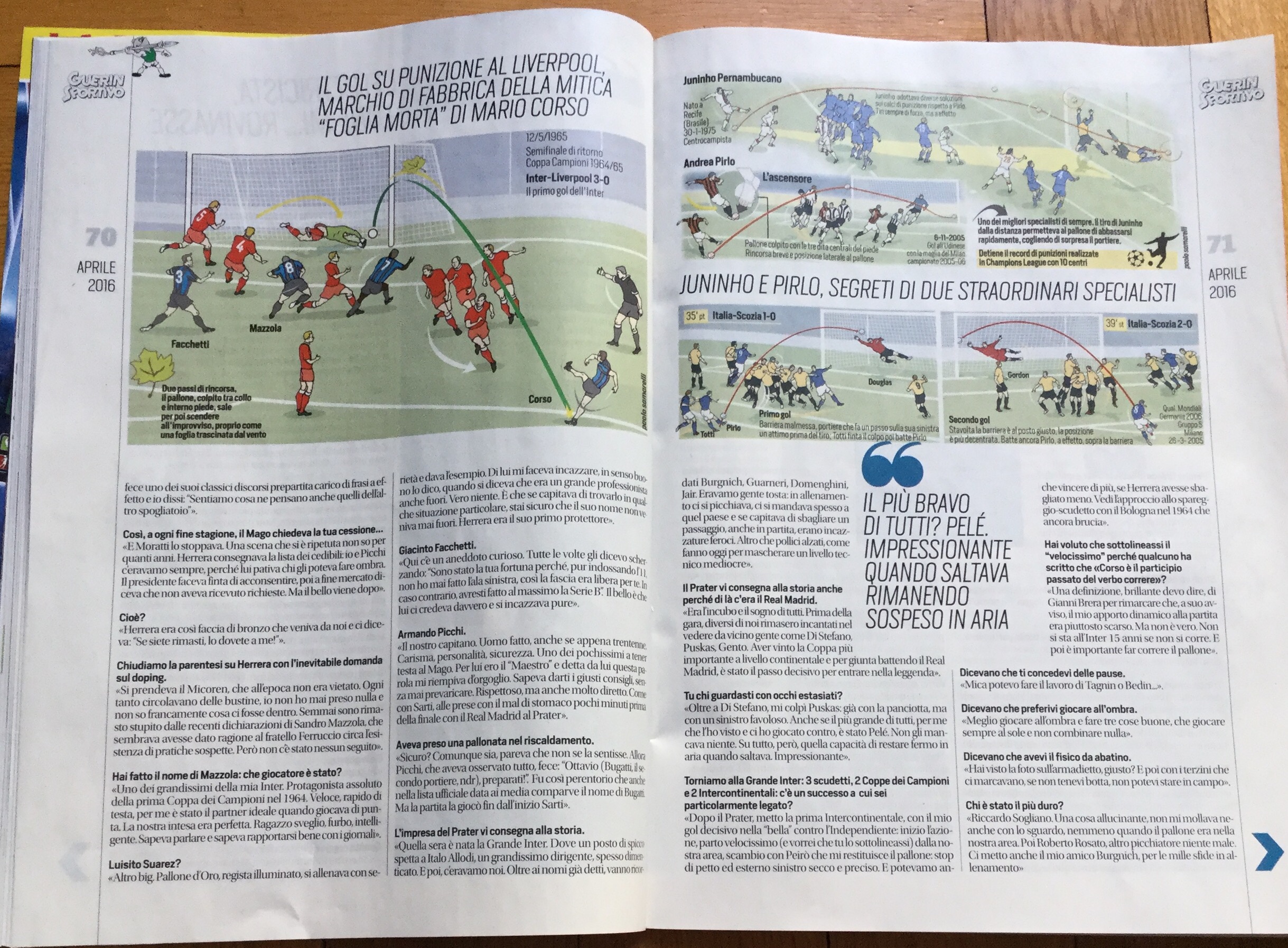 L’articolo è titolato “Tiro mancino” e non si poteva fare differentemente. C’è il racconto dell’epopea dell’Inter di Helenio Herrera, dei suoi compagni di squadra, Facchetti, Mazzola, Jair e gli altri mandati a memoria da una generazione. Ci sono i giornalisti dell’epoca Gianni Brera su tutti (leggete qui che ne pensa Gianni Mura). Infine (è lì ho disegnato) la storia del suo celebre tiro “a foglia morta” sulle punizioni. E gli altri che di quel calcio da fermo hanno fanno la storia: Juninho Pernambucano e certamente Andrea Pirlo che ha portato fosforo al calcio anche negli Usa.